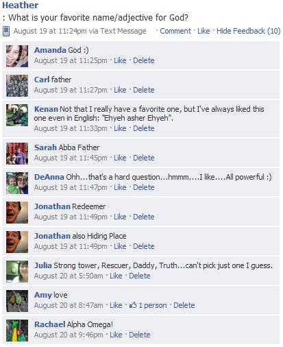 As a fun aside, I asked facebook what their favorite names for God were!